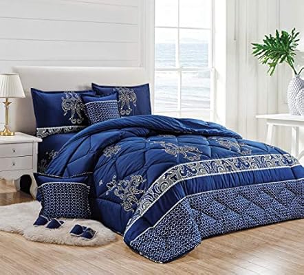 طقم لحاف من Royal Home Collection 650 خيط عدد الخيوط 300 جرام في المتر المربع محشو بألياف دقيقة مخيطة مقاس سرير كبير جد ا بلون أزرق داكن سادة 100 قطن مصري Amazon Ae