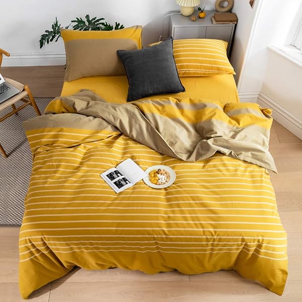 طقم غطاء لحاف من Mkxi أبيض مخطط أصفر الملكة قطن مغسول 100 مجموعة فرش رائعة فندقية مخططة مع أربطة س ح اب مرقعة مجموعة الفراش Toffee والأصفر اشتري اون لاين بأفضل الاسعار في السعودية