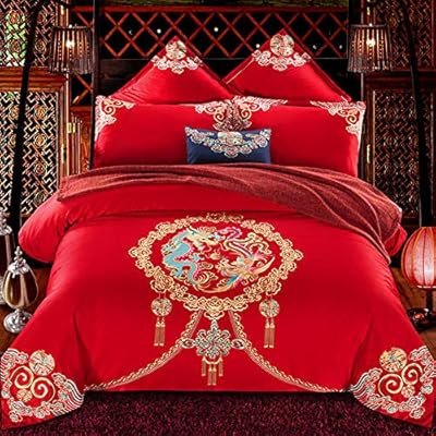 الترويجي الساخن طقم مفرش سرير فاخر من القطن موضة 100 باللون الأحمر لحفلات الزفاف غطاء لحاف مطرز بتنين طائر الفينيق الذهبي مفرش سرير مزود بعلم وملاءة سرير وأكي في الخط Guaqkitchenonline