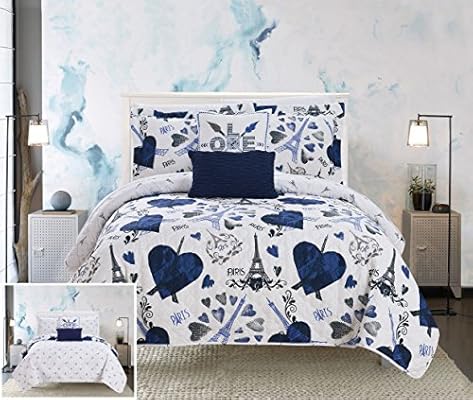 طقم لحاف ذو وجهين من Chic Home Grand مقاس 5 قطع Paris Is Love مطبوع بتصميم مستوحى من الحب غطاء سرير مزخرف يتضمن أغطية للوسائد مايكرو فايبر كحلي Full Amazon Ae