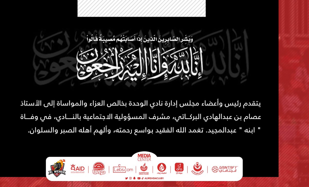 نادي الوحدة السعودي على تويتر رئيس وأعضاء مجلس الإدارة يعزون أ عصام بن عبدالهادي البركاتي في وفاة ابنه عبدالمجيد Ealbrkaty